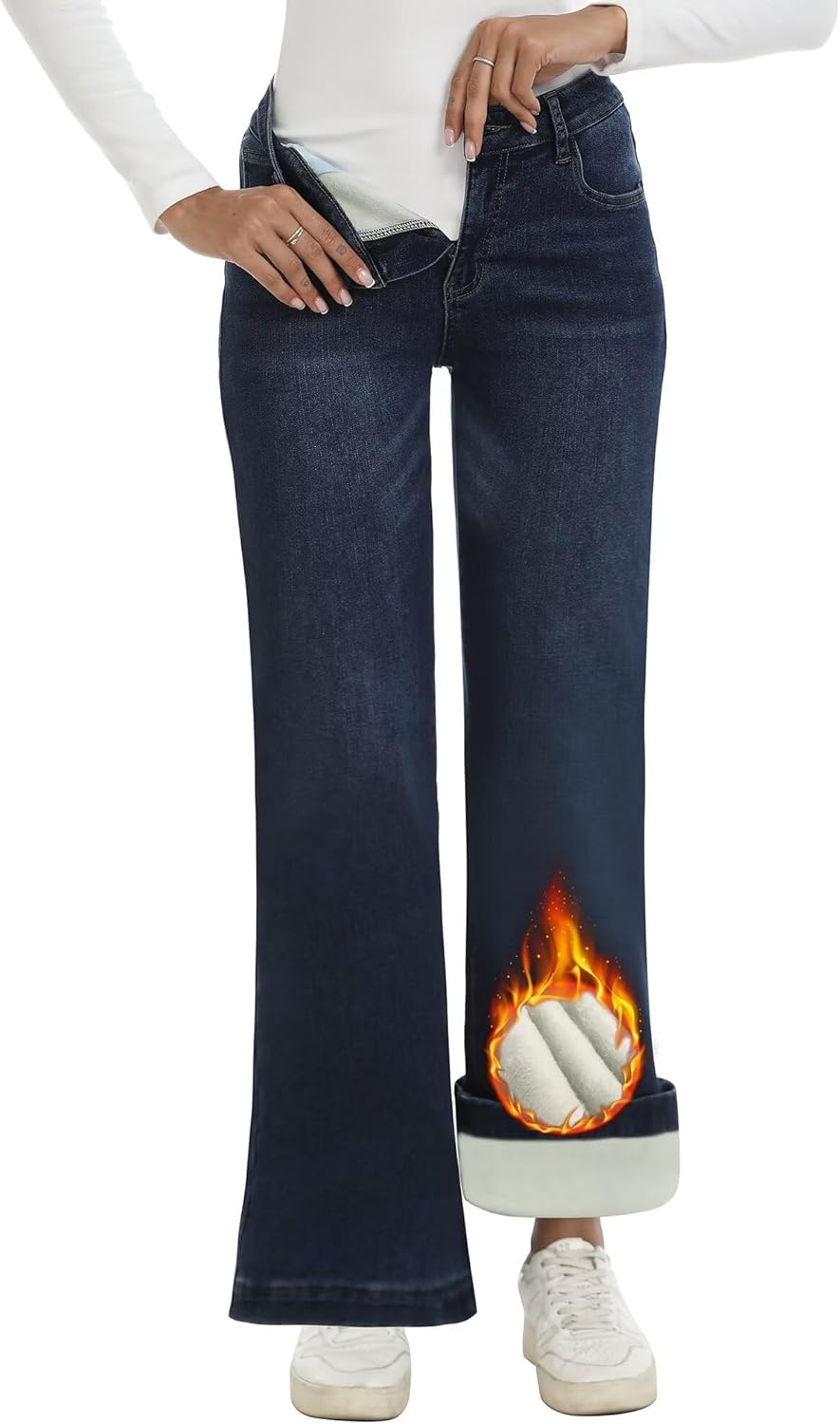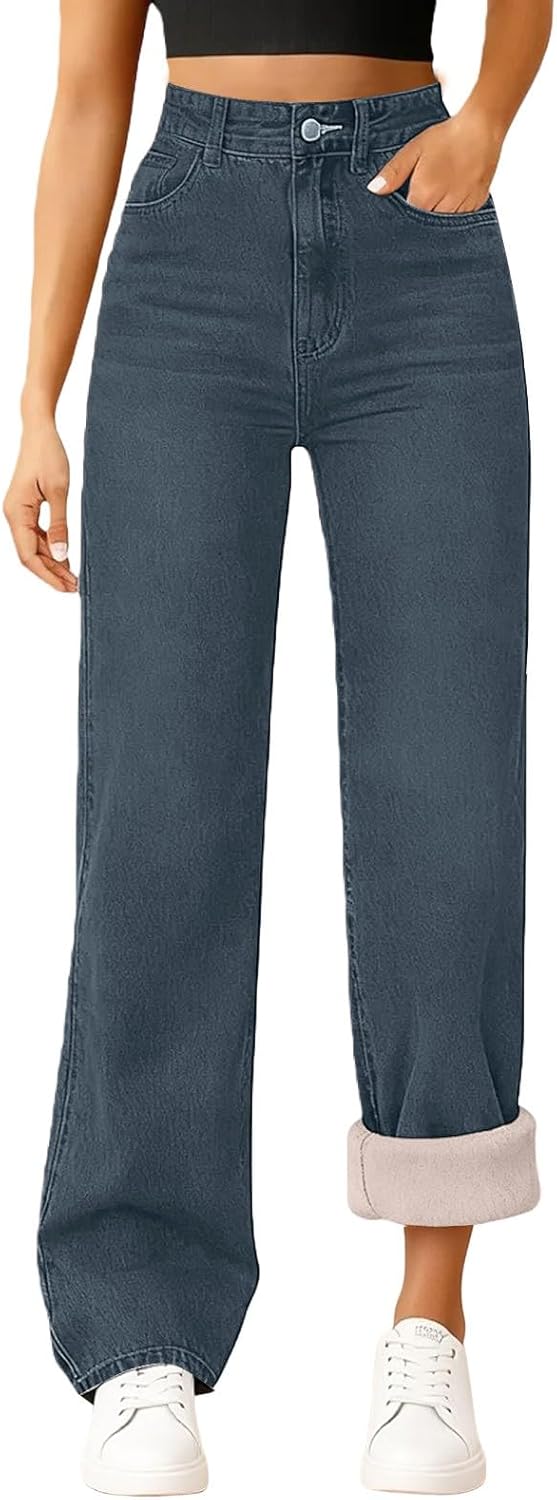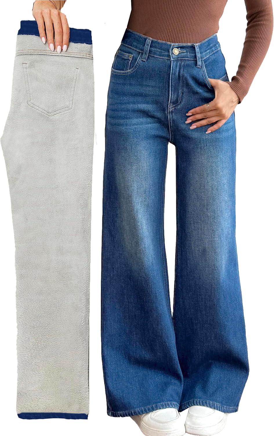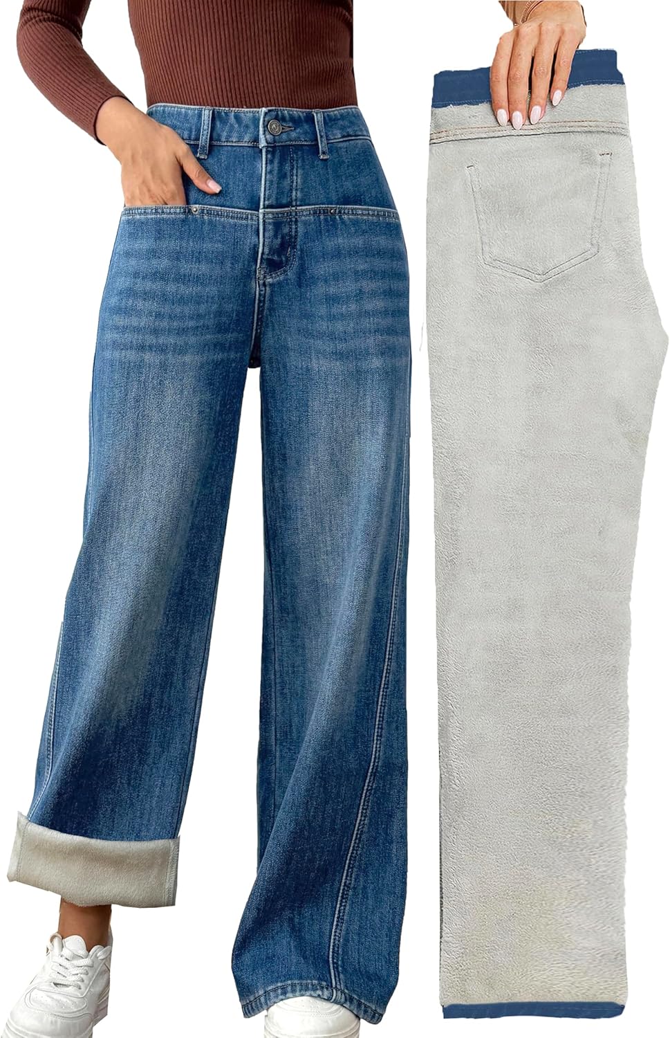 About this item Fleece Lined for Added Warmth Provides Extra Comfort in Cold Weather High Stretch Denim Fabric Offers a Flattering and Comfortable Fit Wide Leg Design Creates a Trendy and Relaxed Silhouette Stylish Classic Wash Blue Color Goes Well with Variety of Tops Durable Denim Construction Ensures Long Lasting Wear